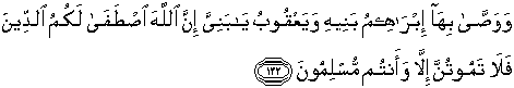 [2:132] Dan Ibrahim telah mewasiatkan ucapan itu kepada anak-anaknya, demikian pula Ya'qub. (Ibrahim berkata): "Hai anak-anakku! Sesungguhnya Allah telah memilih agama ini bagimu, maka janganlah kamu mati kecuali dalam memeluk agama Islam".